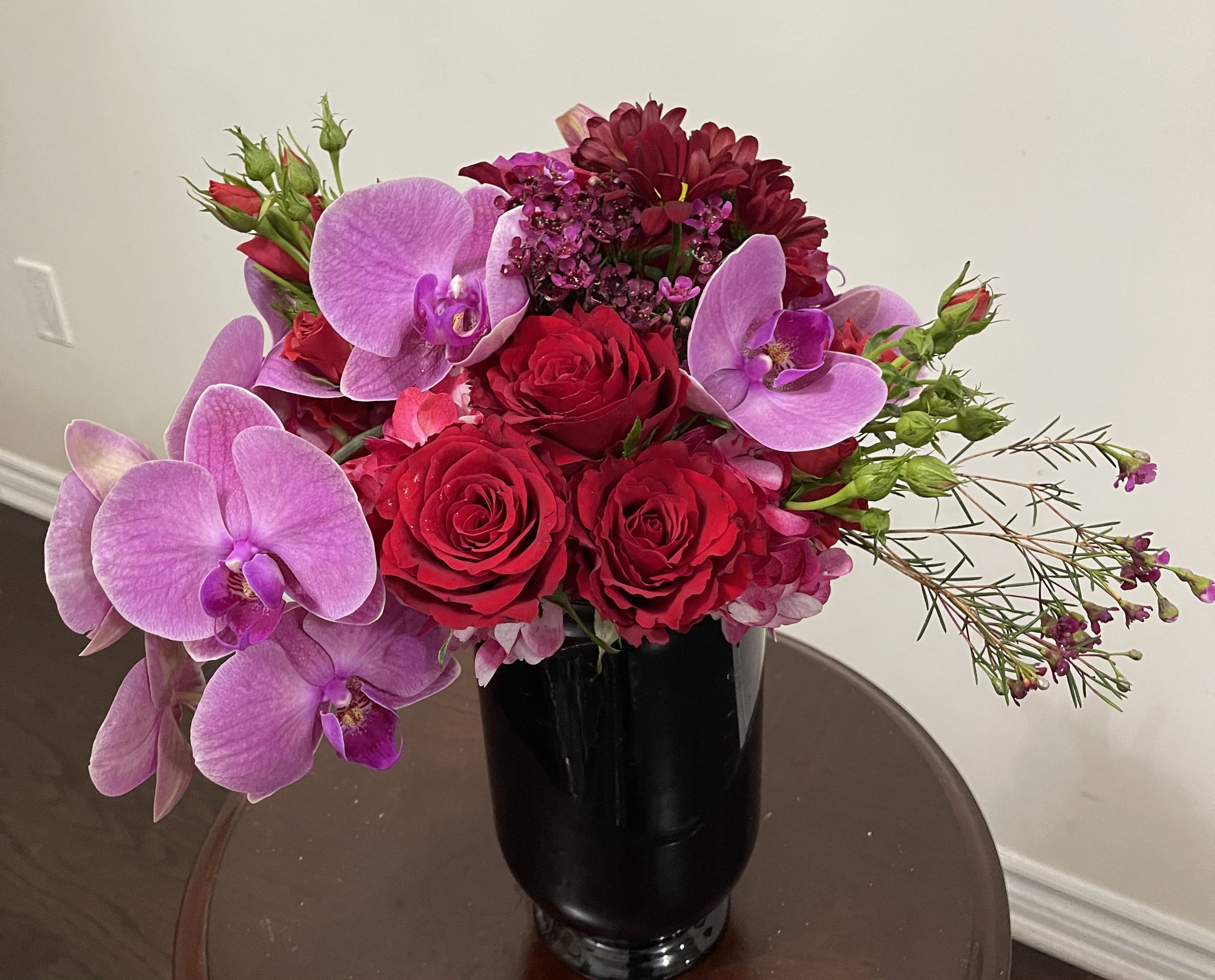 Red roses & spray roses, pink hydrangeas, pink orchids and other flowers in a black glass vase.